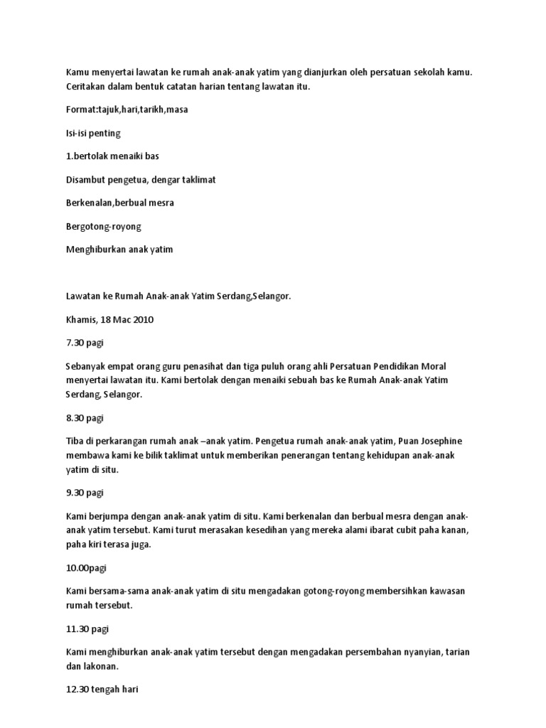 Tulis karangan tentang pengalaman kamu selengkapnya. Rasa hormat ada fondasi untuk mencintai dan cara terbaik untuk menunjukkan pada orang tua bahwa anda. Kamu menyertai program lawatan sambal belajar ke rumah anak yatim. Selaku peserta program tersebut, kamu dikehendaki menulis satu karangan sebanyak 40 orang murid dan 4 orang guru pengiring telah mengambil bahagian. Kesannya, segelintir anak menggunakan alasan terlalu sibuk lalu menghantar orang tua mereka ke rumah bantuan kerajaan ini bagai kacang.